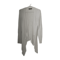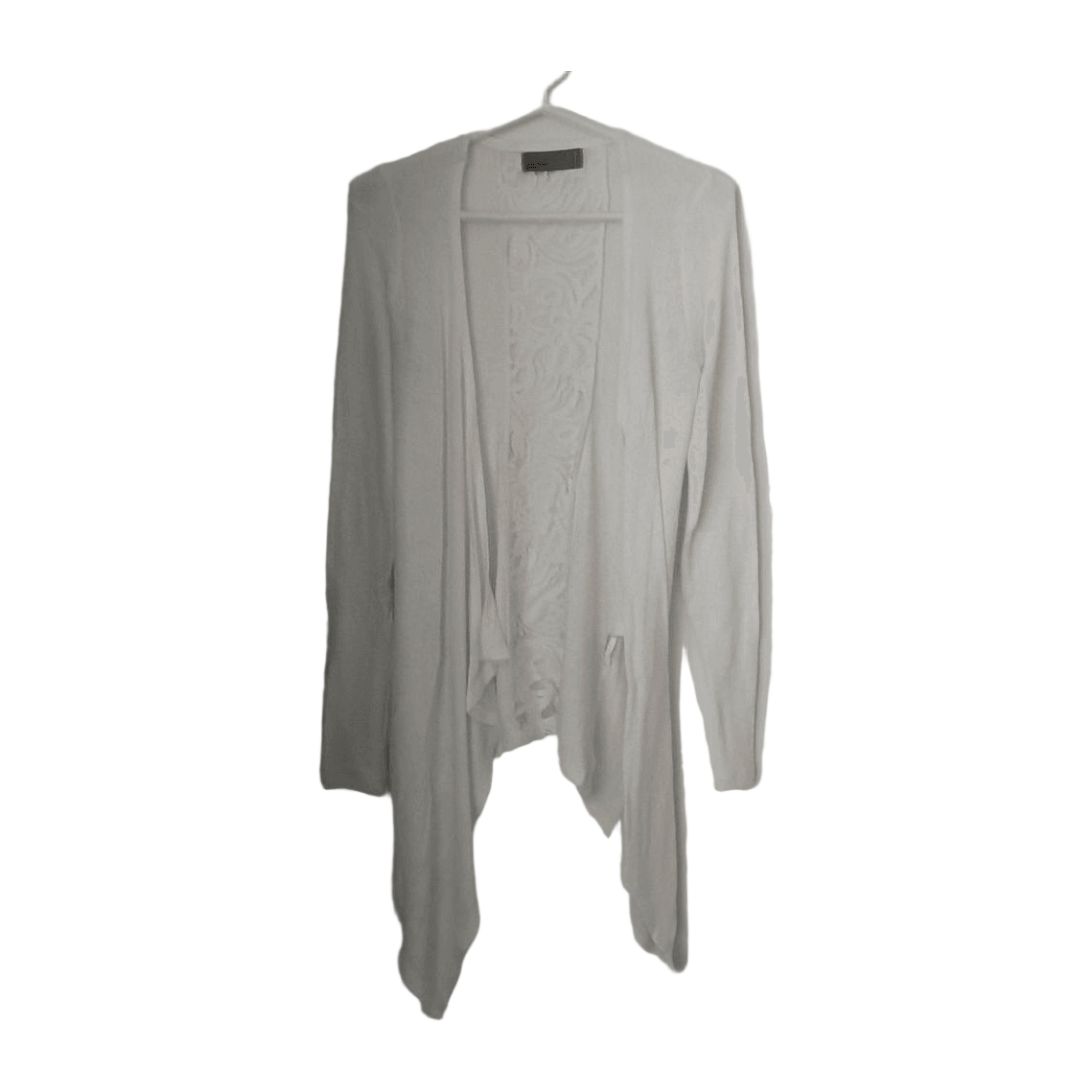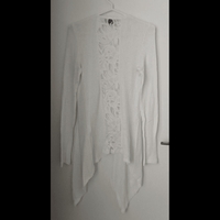 Kaunis valkoinen neuletakki, jonka selässä upea pitsikaistale. Edestä pidempi malli. Pehmeää, joustavaa neulosta.