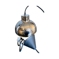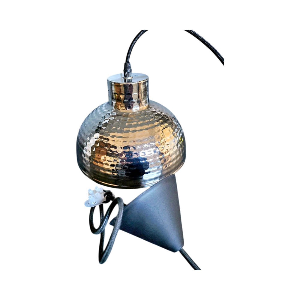 Lyöty metallivarjostin ripustettavaksi, mukana johto, kattokupu ja liitin.