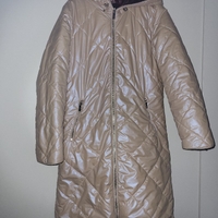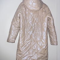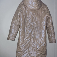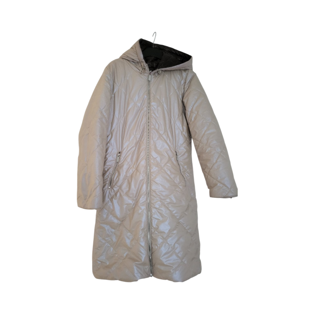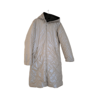 Kevyt, polvipituinen tikattu toppatakki huppulla. Uudenveroinen kunto. Käänteinen puoli burgundyn punainen.