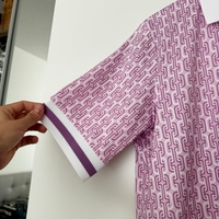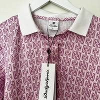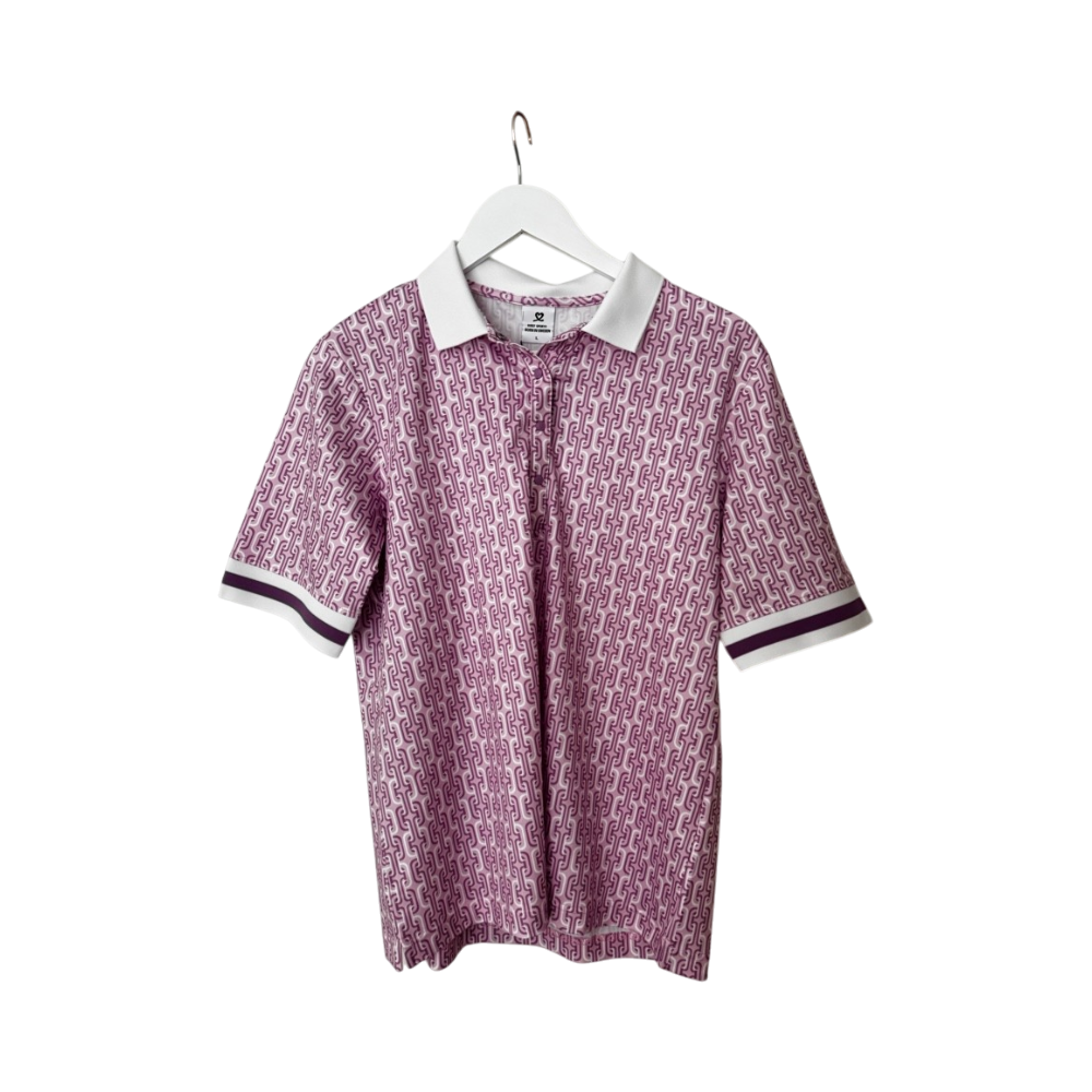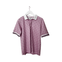 Pink patterned short-sleeve golf polo with white collar and cuff stripes.