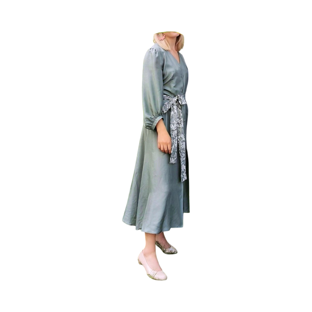 Harmaanvihreä silkkimekko vyöllä