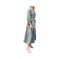 Harmaa/vihertävä silkkimekko vyöllä, pitkät kauniit hihat, napit edessä. 100% silkkiä. Käytetty kahdesti. Ensimmäisessä kuvassa väri auringonvalossa ja se vastaa mielestäni enemmän todellista väriä.