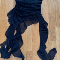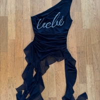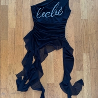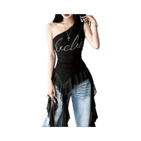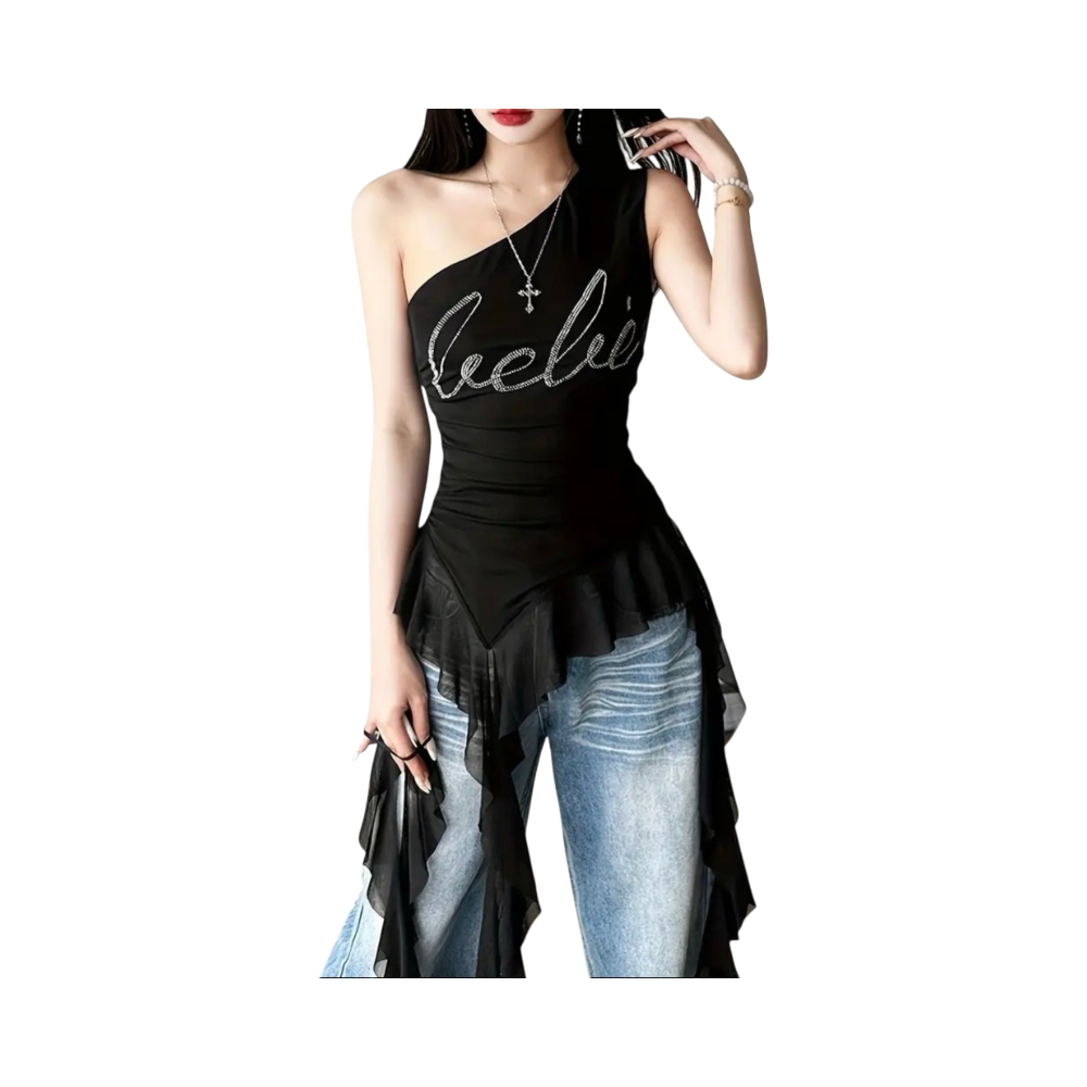 Yksipuolinen sifonkipusero röyhelöillä ja koristetekstillä.
