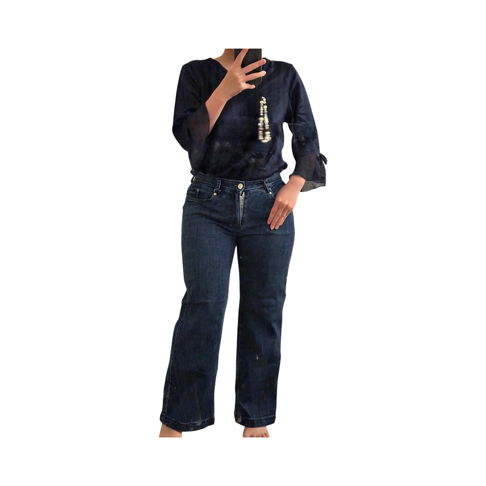 Tailored made mid-rise jeans in good condition. Straight leg style. There are 2 pockets at front and 2 on the back. The jeans sit about 1-2cm below belly button.
