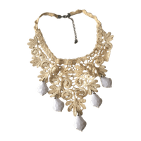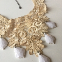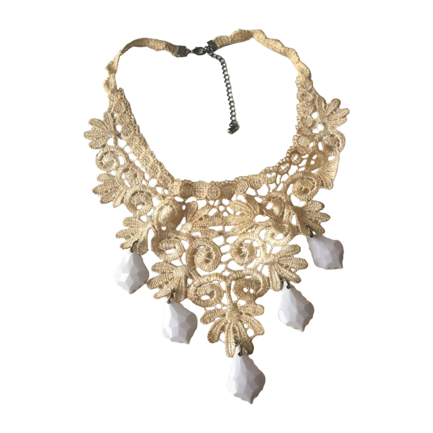 Myydään pitsinen kaulakoru, jossa valkoisia koristeita. Pitsiosa hieman tummunut käytössä, mutta ei ole yritetty myöskään erikseen puhdistaa. Koodilla RH2323 ilmainen toimitus.