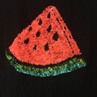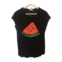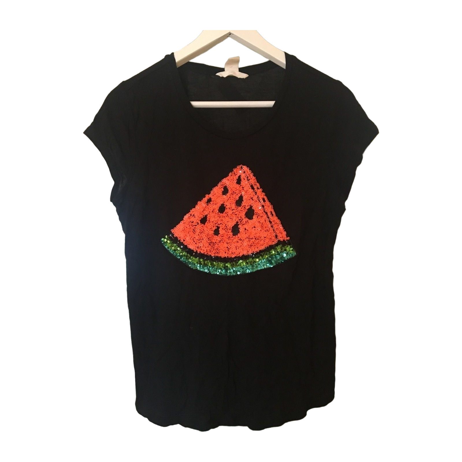 Myydään H&M:n musta t-paita, johon kirjailtu glitterinen vesimeloni. Materiaalitiedot puuttuvat, mutta kangas todennäköisesti joustavaa viskoosia. Koodilla RH2323 ilmainen toimitus.