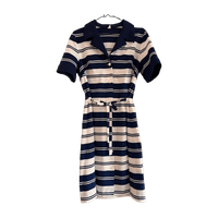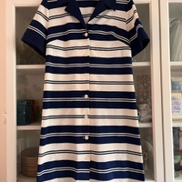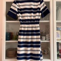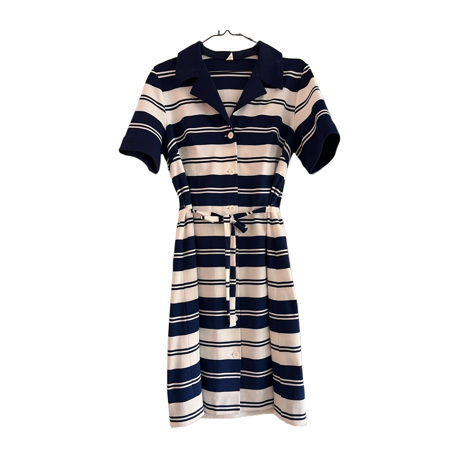 Myydään suomalaisen Muoti Herralan seilorihenkinen vintagemekko. Mekossa ei materiaalitietoja, mutta kangas todennäköisesti polyesteriä. Kangas paksua ja joustavaa. Vyölle tehty takaosaan kuja, mutta koko vyön saa halutessaan irti. Takaosassa pieni tahra, joka ei haittaa käyttöä.