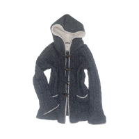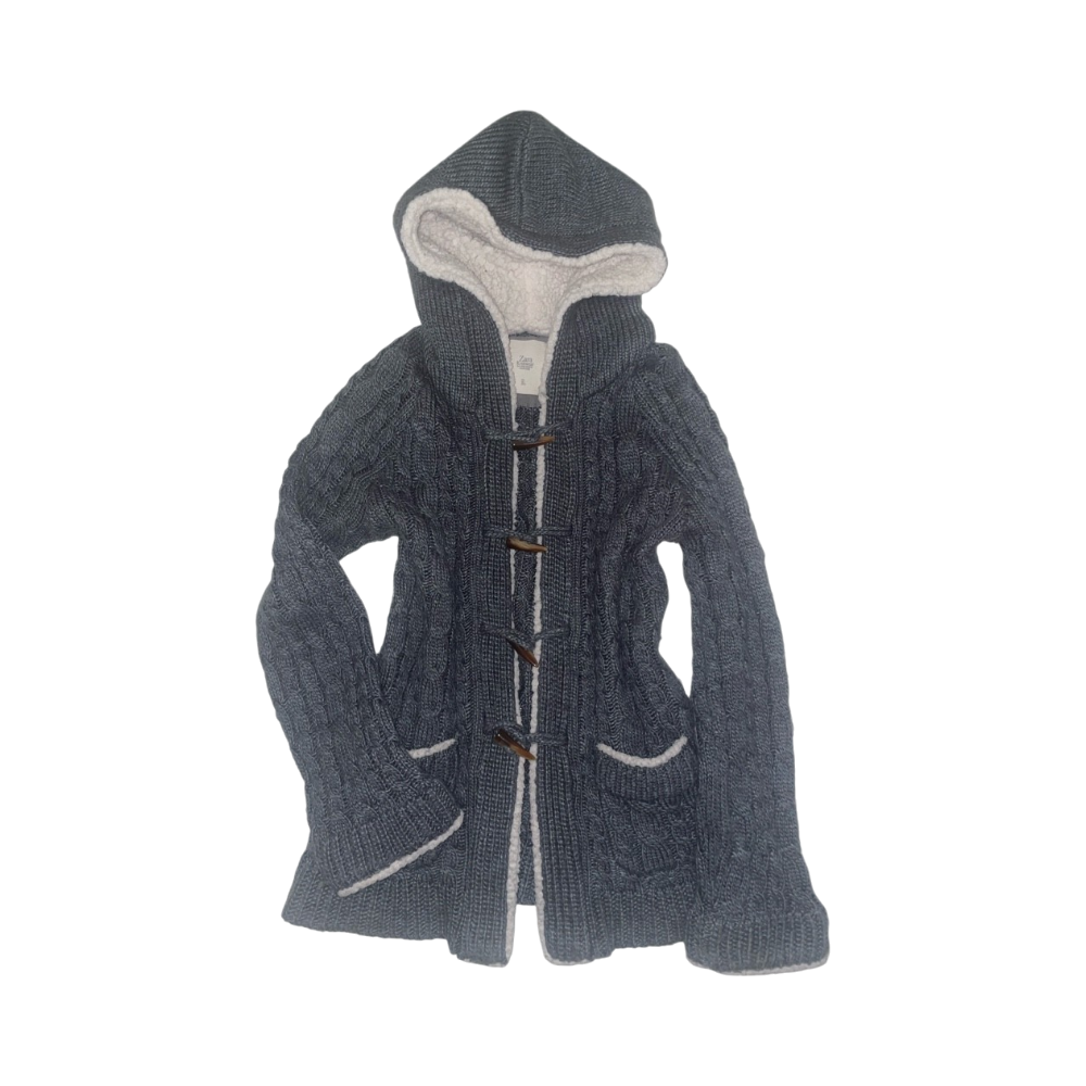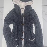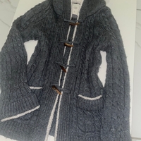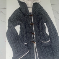 Pehmeä, karvallinen vuori ja puiset hakaset, lämmin neuletakki.