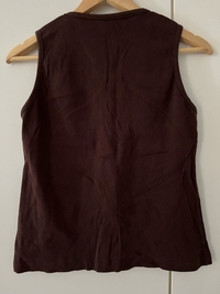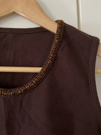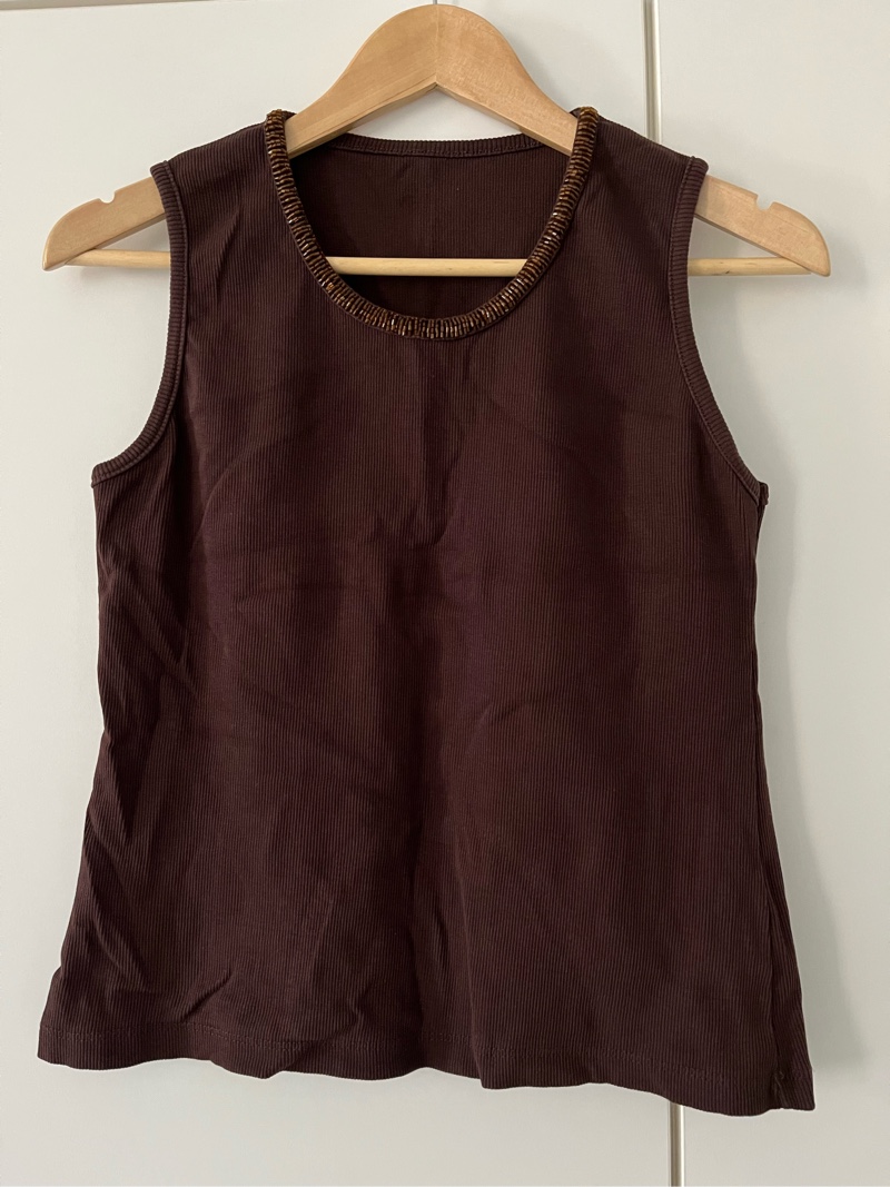 Ruskea toppi helmikirjailulla kaula-aukossa. Ei kokolappua mutta arvioisin S/M kokoiseksi. Uuden veroisessa kunnossa. Made in Greece