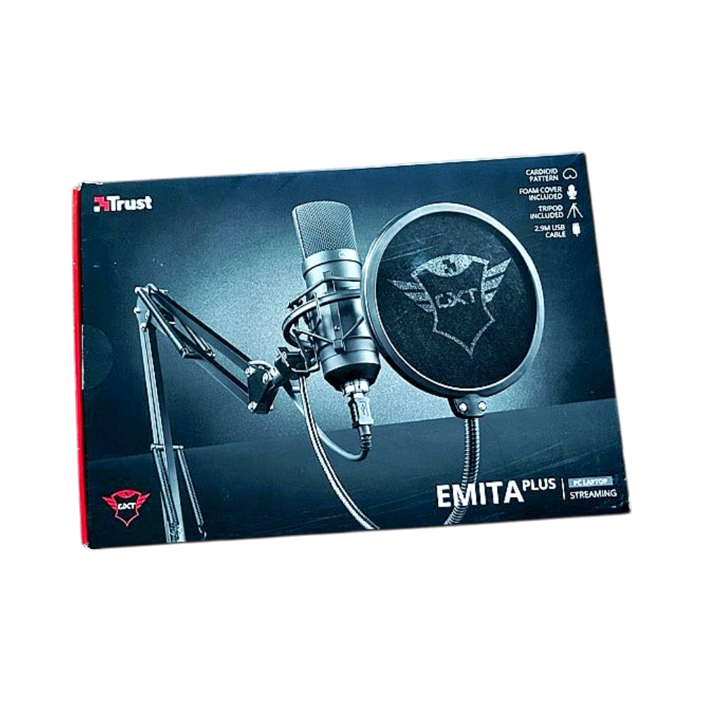 Trust GXT252 Emita Plus microphone. Used once to record a podcast episode but not anymore after that. Good as new. Includes manual and all the components for three different settings.