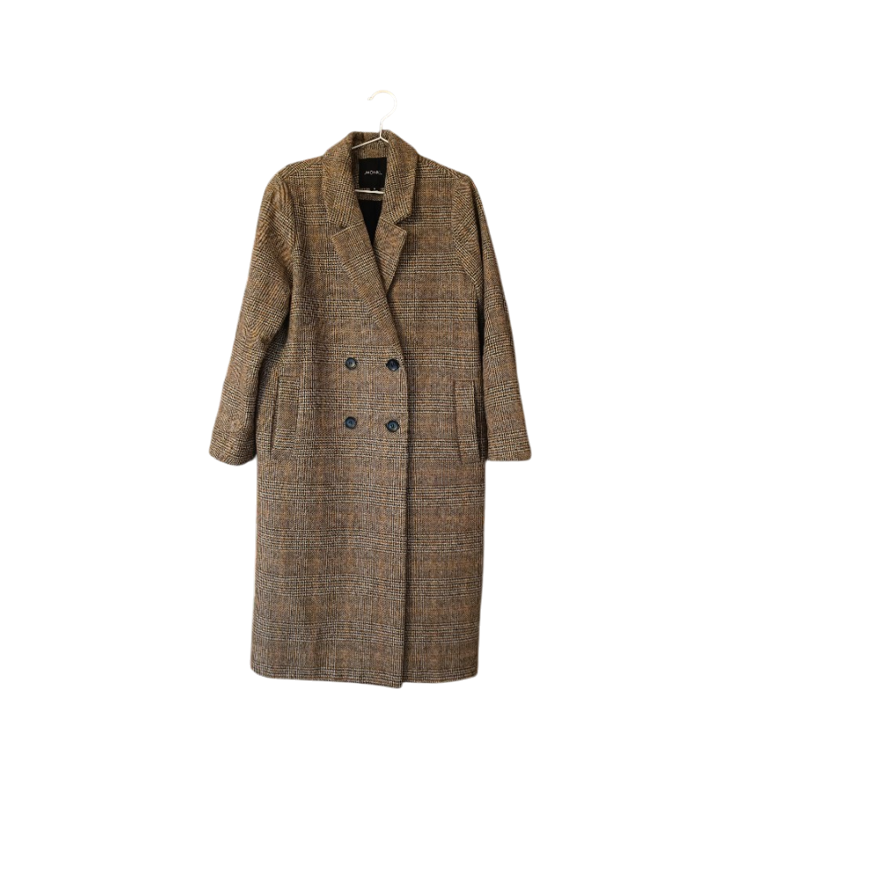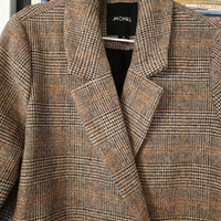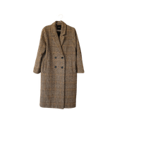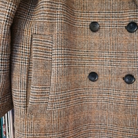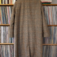Pitkä, kaksirivinen ruutukuosinen villakangastakki, hyväkuntoinen.