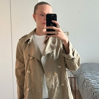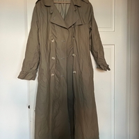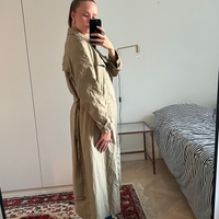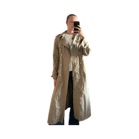 Double-breasted long beige trench coat, vintage H&M x Luhta collaboration. Made in Finland. No size tag but I'd say fits S-L depending on the desired fit. I'm usually S/M and it has a nice, oversized fit.