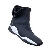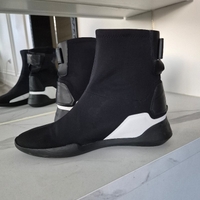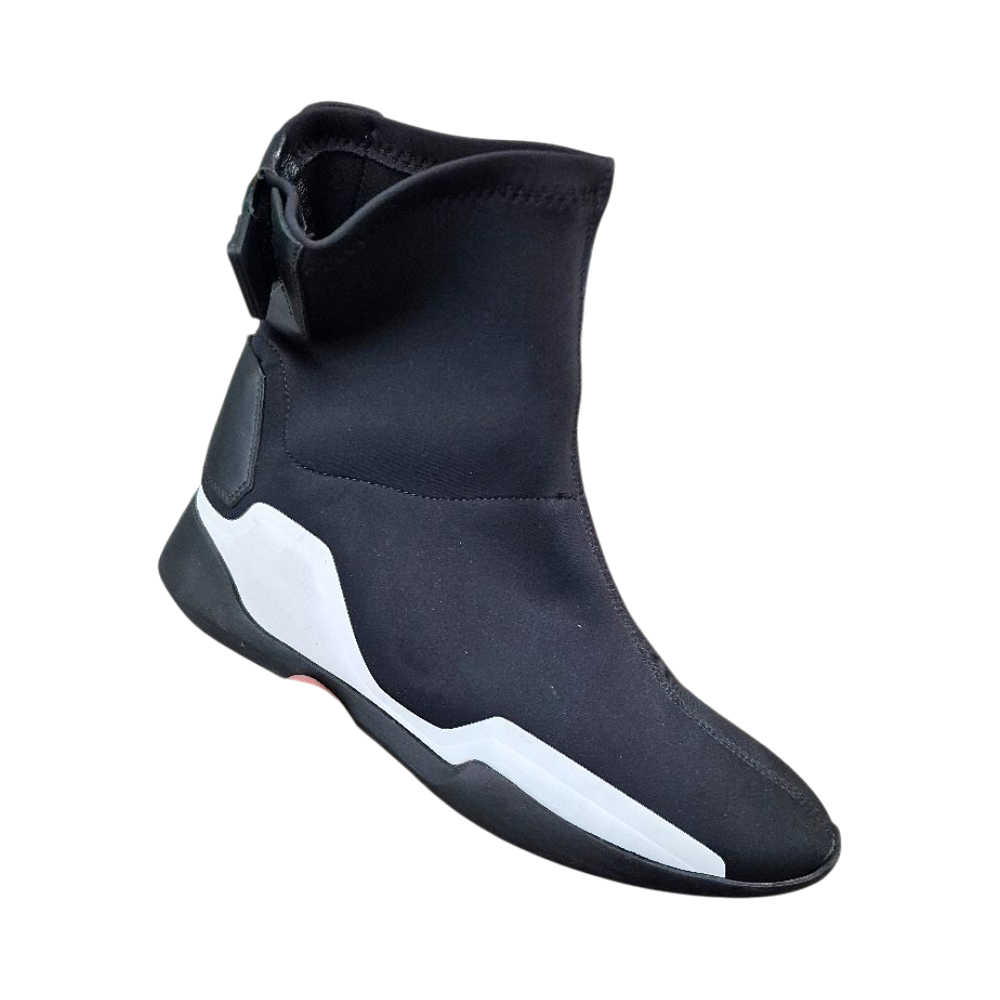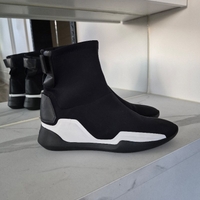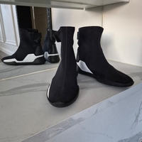 Modern black sock-style boots by Vic Matié, size 38. Sleek neoprene-like upper with leather details and a bold black-and-white sole. Lightweight, comfortable, made in Italy.