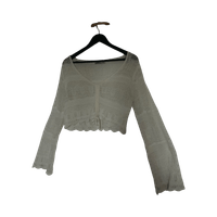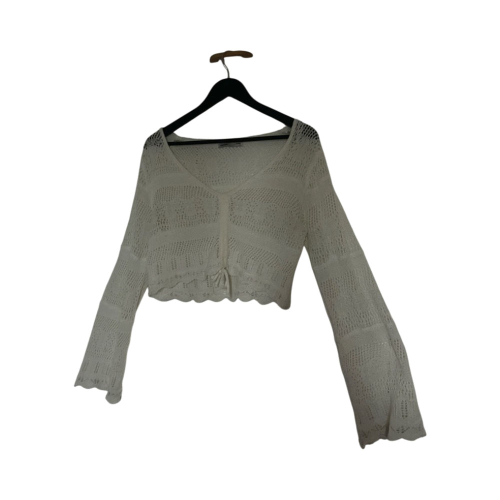 Valkoinen leveähihainen pusero ilman käytön jälkiä tai vikoja. Paidan pituutta voi säätää keskeltä löytyvillä naruilla