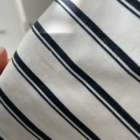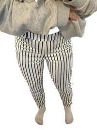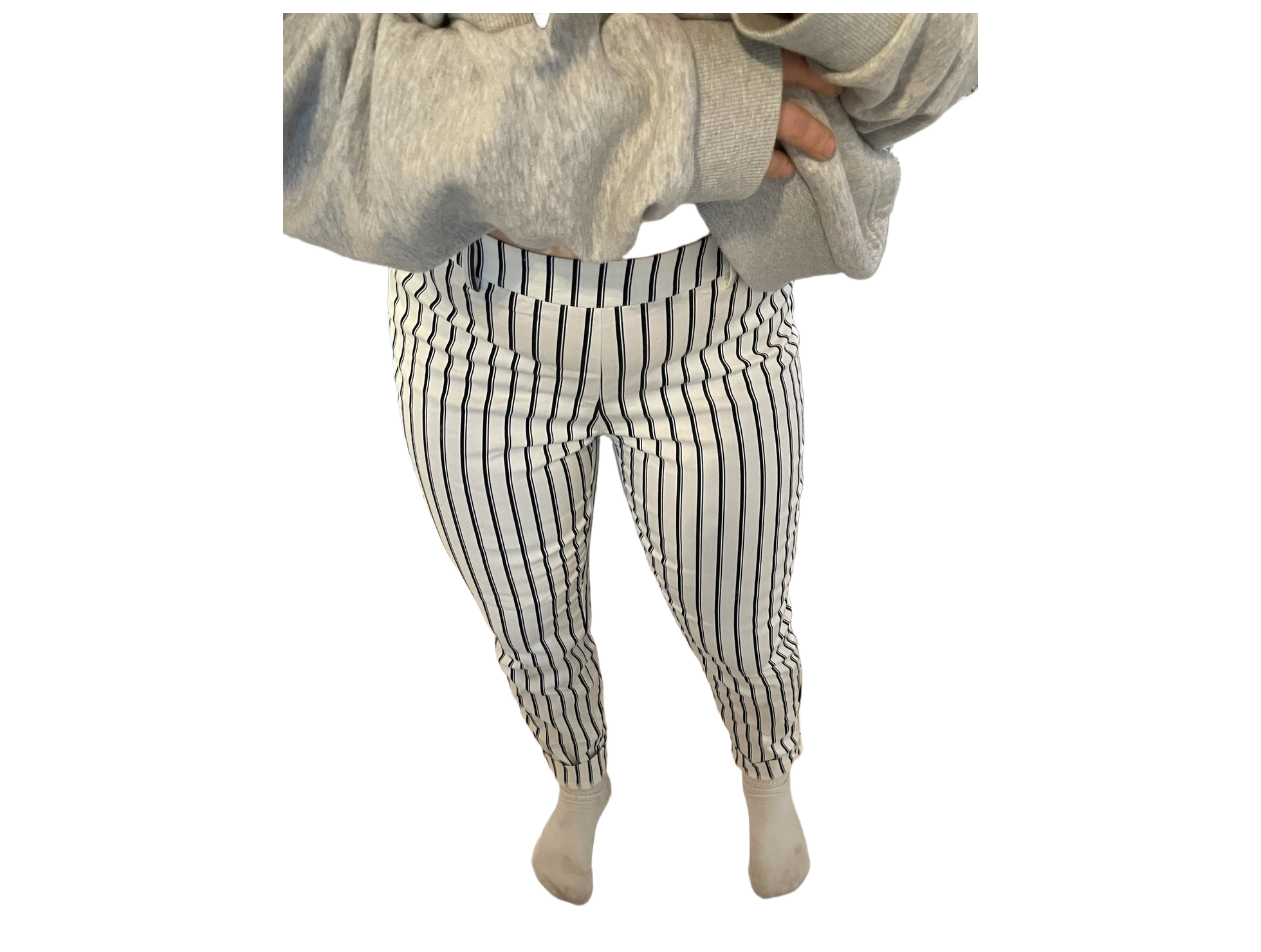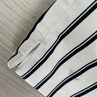 H&M koon 38 raitahousut. Ovat hyvässä kunnossa, mutta kuvissa näkyy kaksi pientä tahraa, lisäksi yksi vyönsolki tummunut. Lahkeissa pienet halkiot. Sivulla vetoketjukiinnitys sekä nappi.