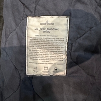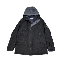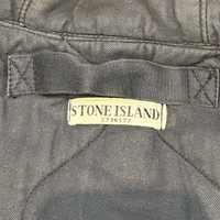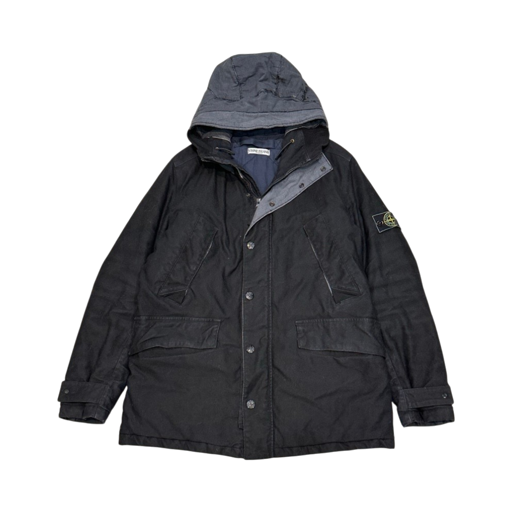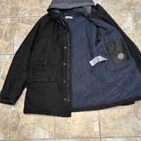 Men's quilted vintage stone island parka with hood and patch logo, navy lining.