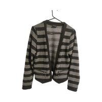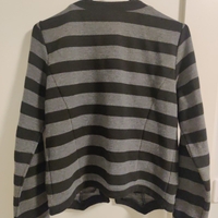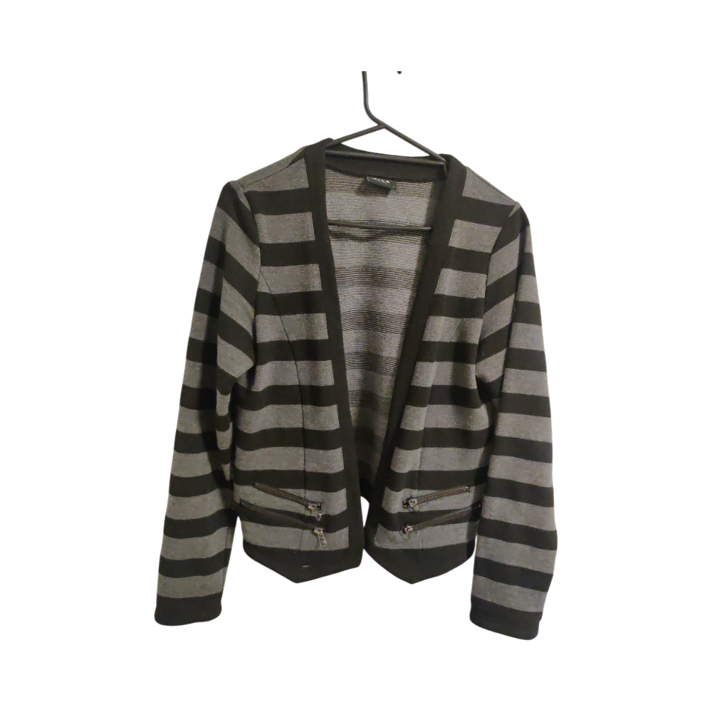 Mustaharmaa raidallinen, vetoketjulliset valetaskut, avoin edusta. Hajusteeton pesu, ei lemmikkejä eikä tupakointia. Hyvä käytetty kunto. Koko pieni L.