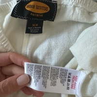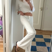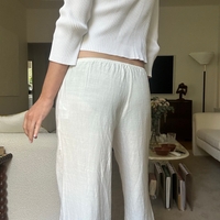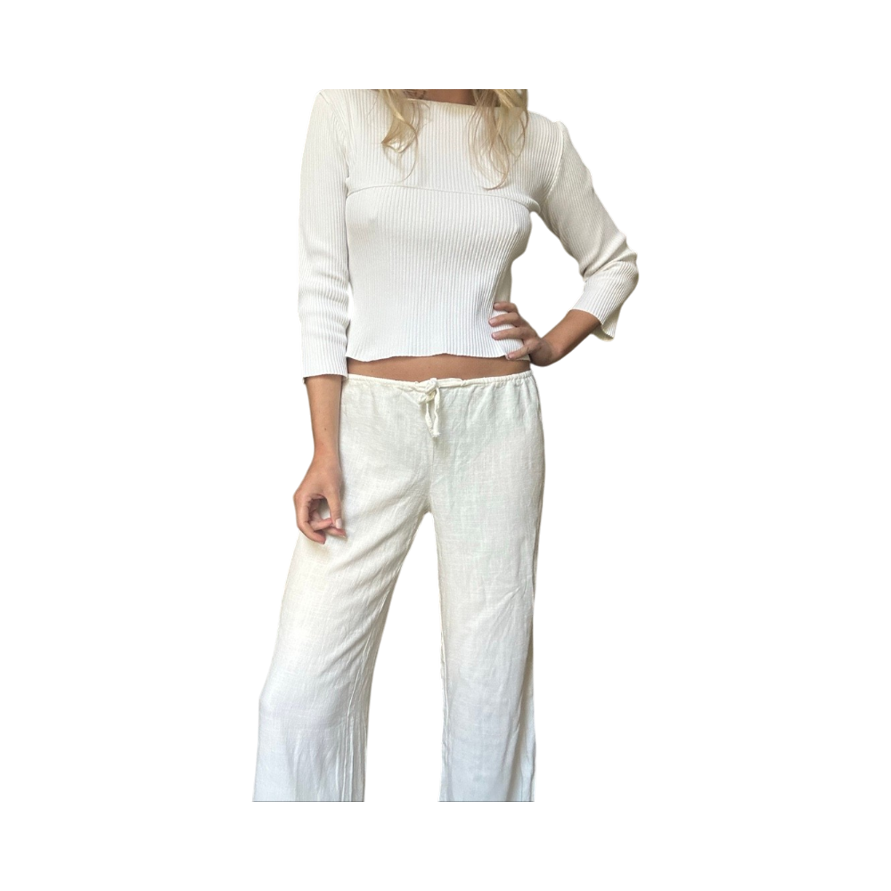 Kevyet, löysät valkoiset pellavahousut nyörivyötäröllä.