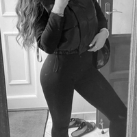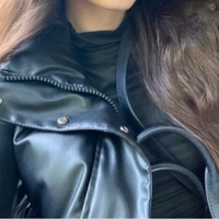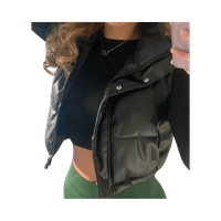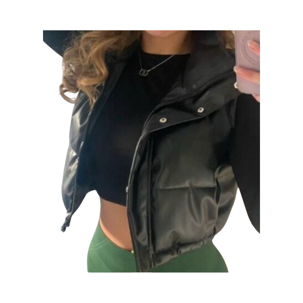 Lyhyt, toppattu keinonahkainen liivi, vetoketju ja napit.