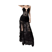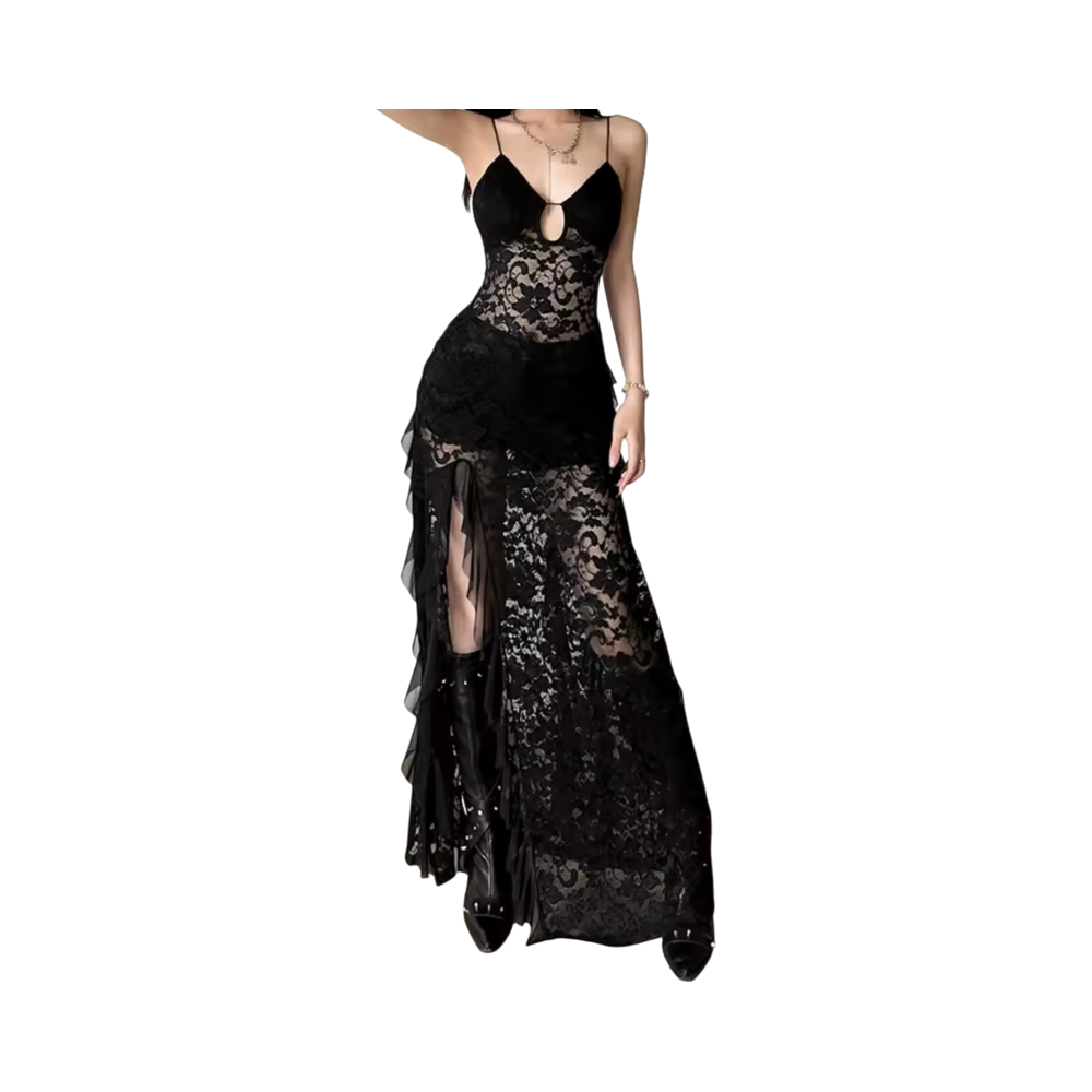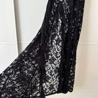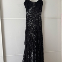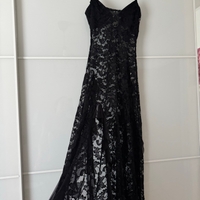 Pitkä musta pitsinen iltapuku ohuilla olkaimilla. Koko S-M