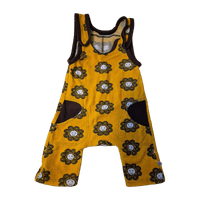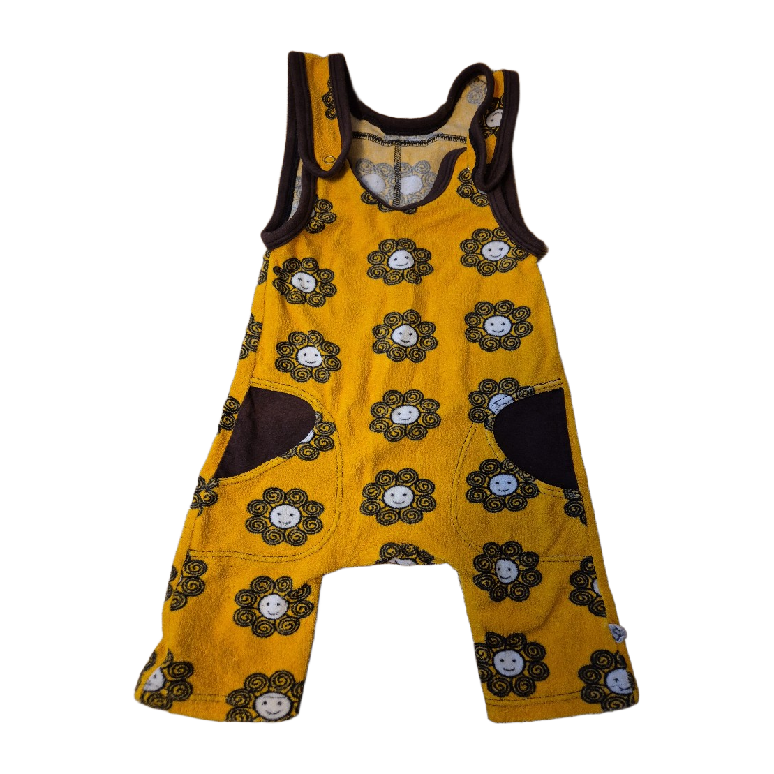 Vauvan haalari, keltainen, kukkakuosi, pehmeä materiaali. Koko noin 86 cm. Taskullinen.