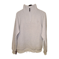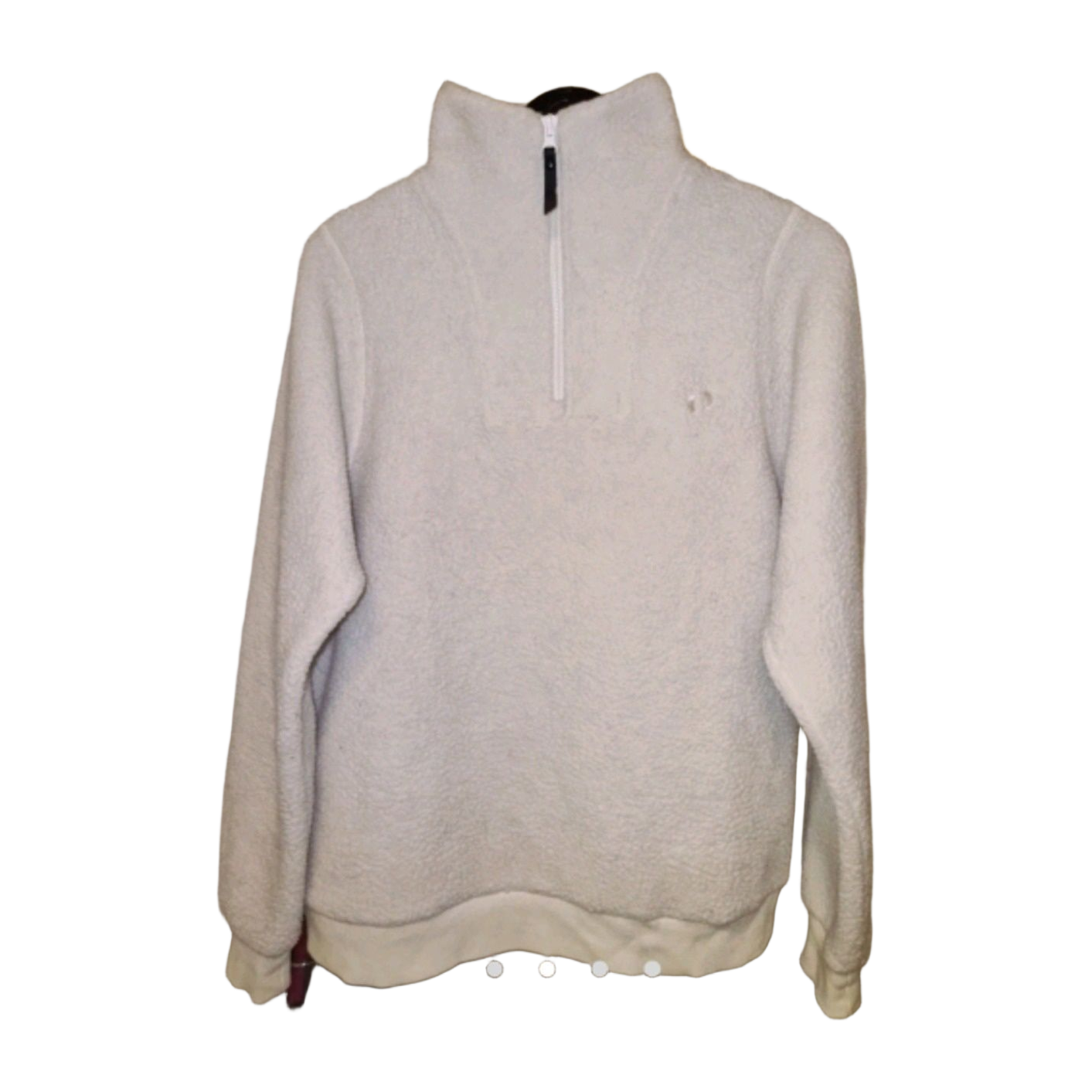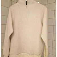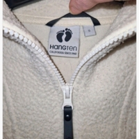 Hangten luonnonvalkoinen pitkähihainen teddyfleece-pusero/takki, jossa on rinnassa pieni Hangten-logo, ja yläosassa on vetoketju. Kokomerkintänä on S, ja tämä sopii myös XS-kokoisillekin hieman rennompana mallina.