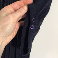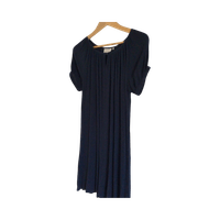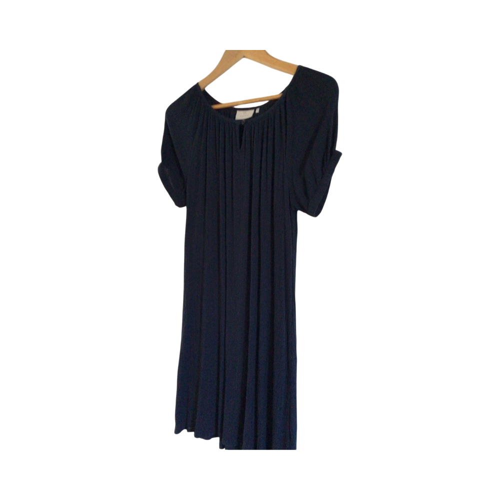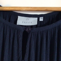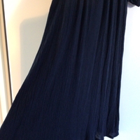 Kaffen söpö tummansininen tunika/mekko. Kokolapussa 34, menee myös koolle 36. Väljä, rento malli, kainalo-kainalo mitta vapaasti laskeutuen n. 44cm ja väljenee 51cm saakka, pituus n. 90cm. Hihoissa napit. Siistissä kunnossa, aavistus viskoosille tyypillistä haitua pinnassa. Kuuluu olla rypytetty kangas.