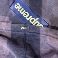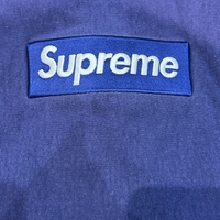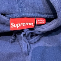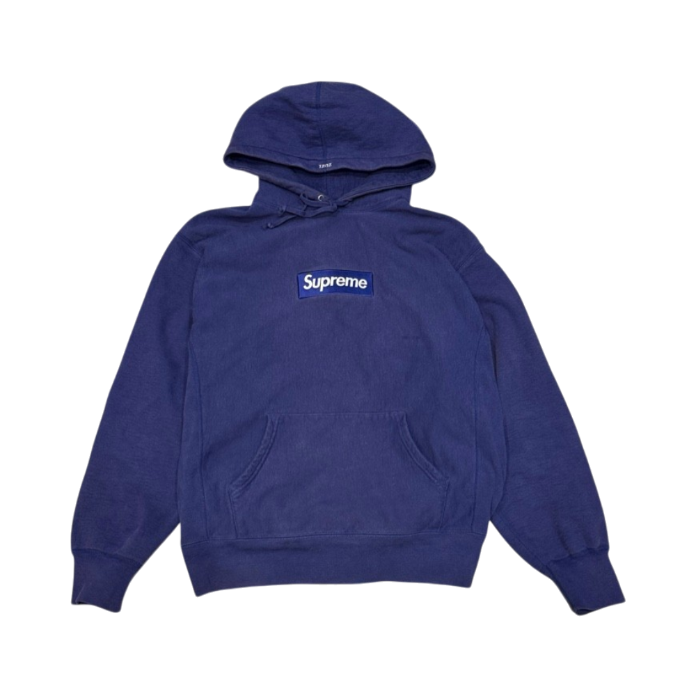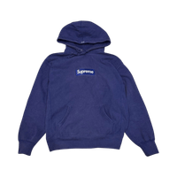 Navy cotton hoodie with blue embroidered Supreme box logo.
