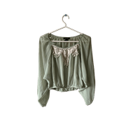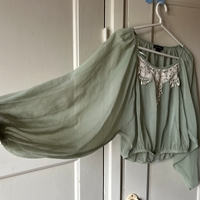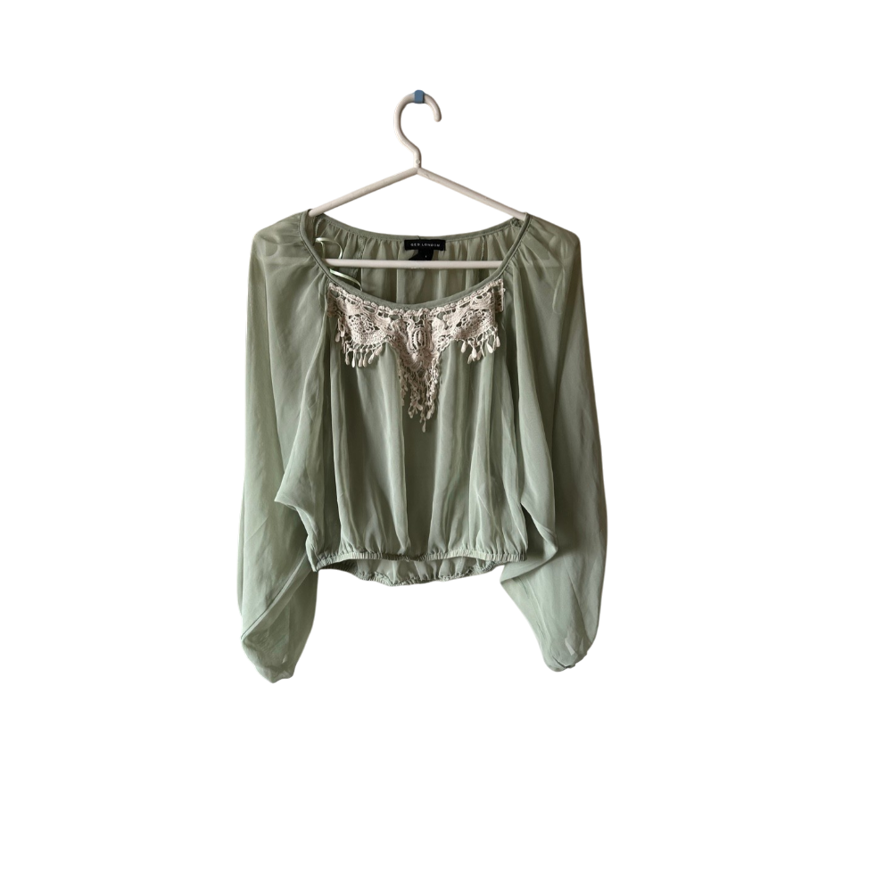 Kevyt mintunvihreä chiffon-pusero, pitsikoriste edessä, lyhyt malli.