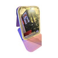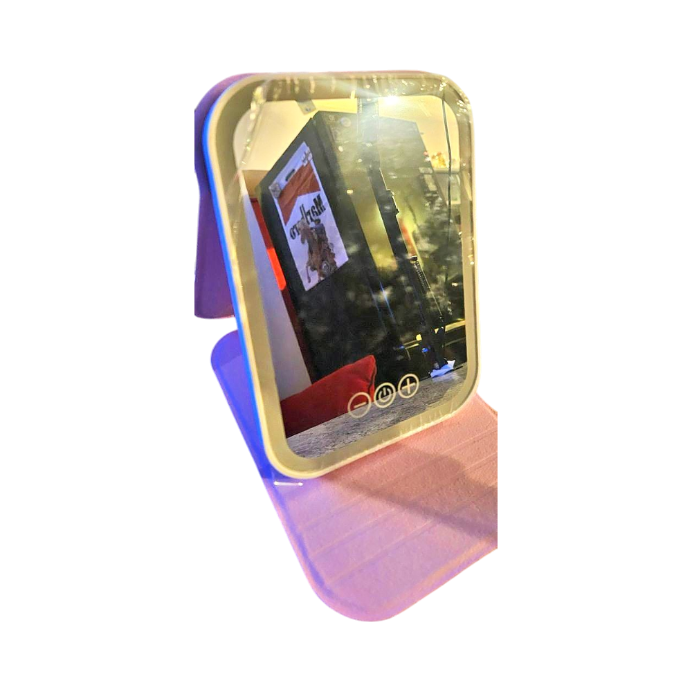 Compact LED mirror with a pink base for easy makeup.