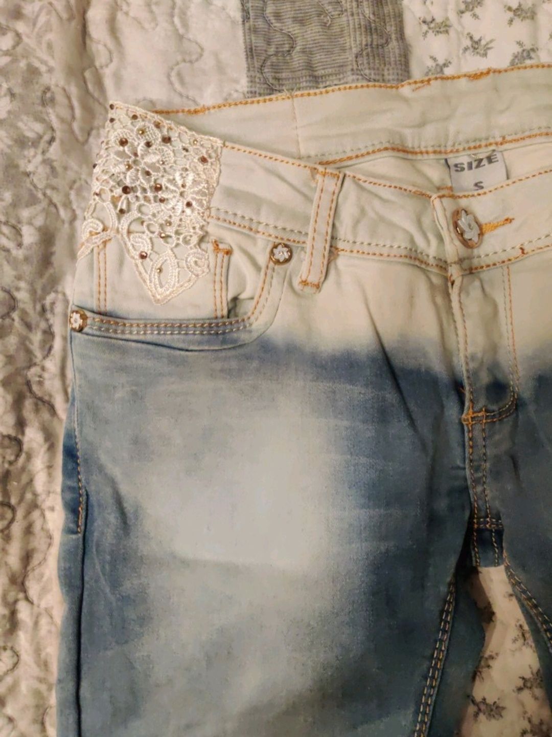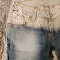 Koko S. Vain muutaman kerran käytetyt. Matala vyötärö. Yllättävän joustava kangas. Taskut edessä ja takana. Pesulappu yhä paikallaan. Kannattaa pestä nurinperin tai pesupussissa.