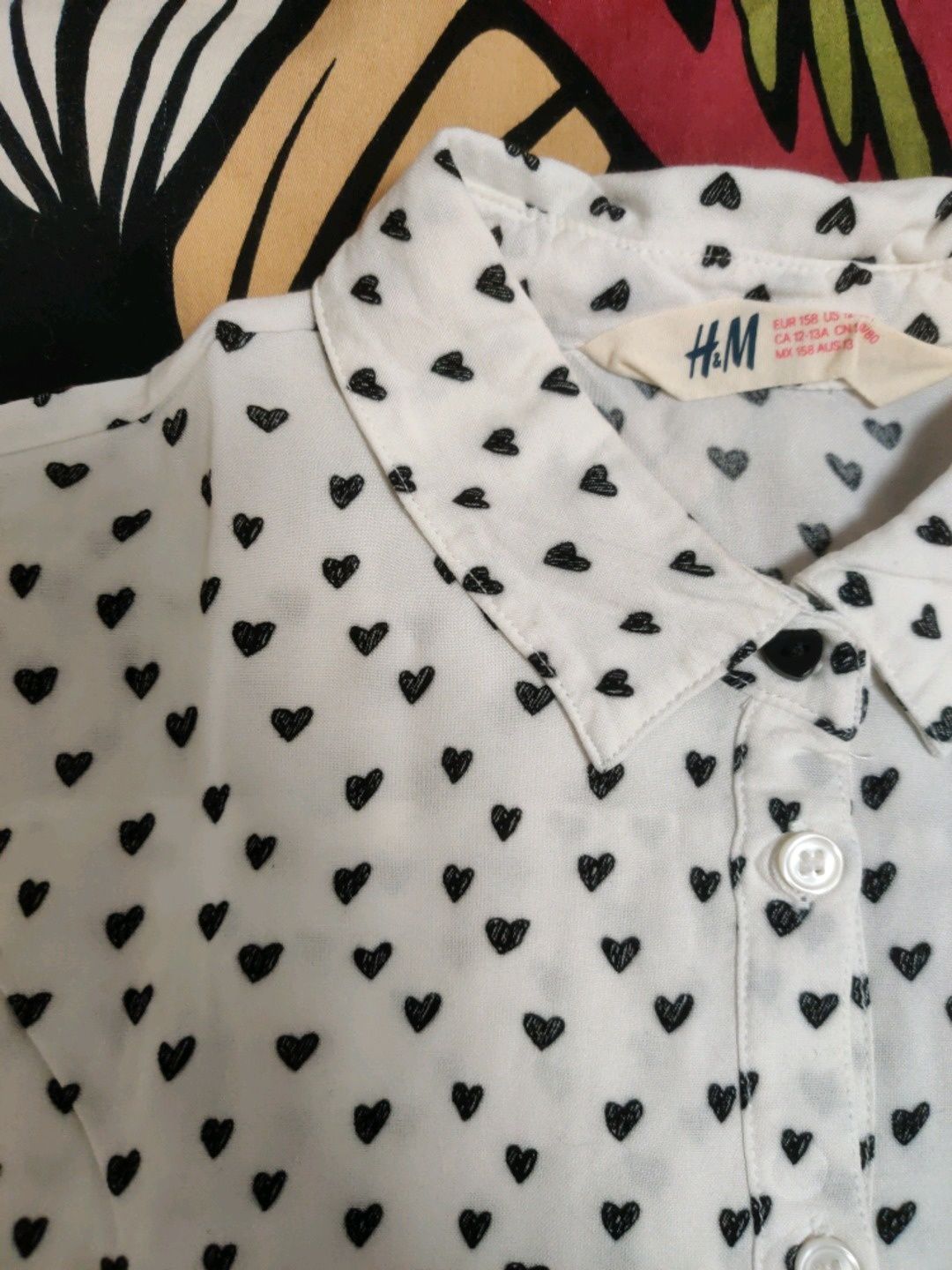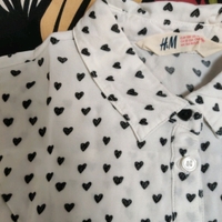Lastenpuolelta joten koko 158, mutta on minulle joka käyttää kokoja XS-S muuten sopiva, mutta hihat jäävät lyhyeksi. Kangas ei juurikaan jousta, muttei myöskään ole sähköinen. Rypistyy hiukan säilytyksessä, siliää yleensä käytössä. Ylin nappi söpö sydän, muut tavallisia. Rinnassa pieni tasku. Pesulappu yhä paikallaan.