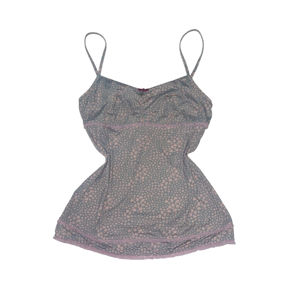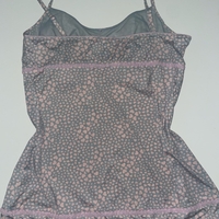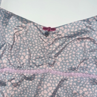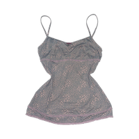 Vaaleanharmaa ja vaaleanpunainen satiinityylinen toppi, pitsireunuksin.