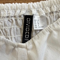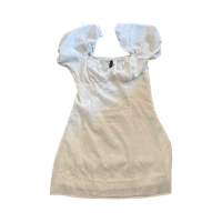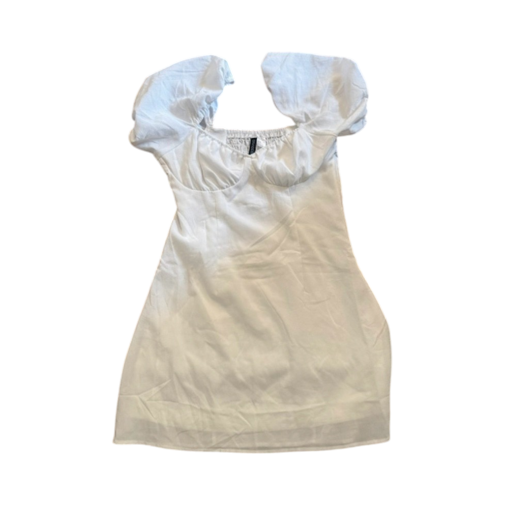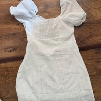Lyhyt valkoinen mekko, puffhihat ja smokkia selässä.