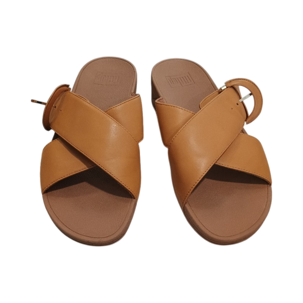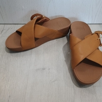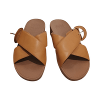Tan crossover straps with buckle; comfortable slip-on sandals.