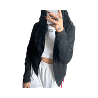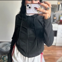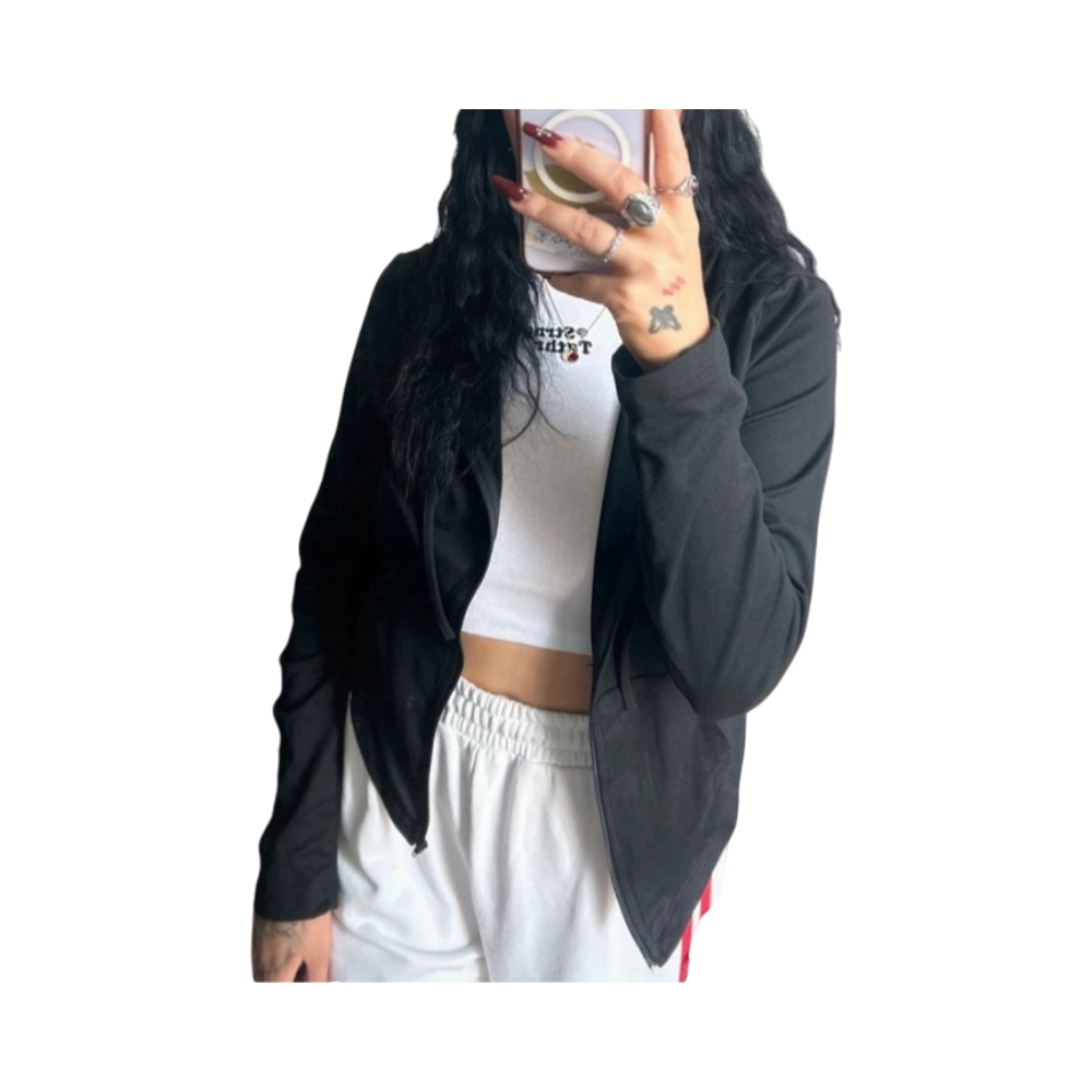 Slim black zip-up hoodie with hood and front pockets. NEW, wrong size for me. came with no tags.