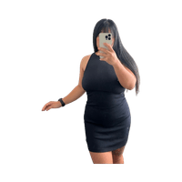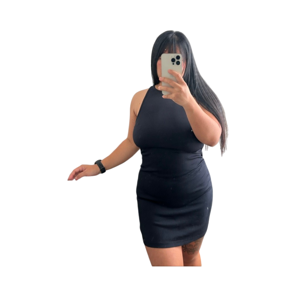 Musta, vartalonmyötäinen ribbimekko, avonainen selkädetail.