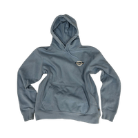 Vaaleansininen, hupullinen collegehuppari.