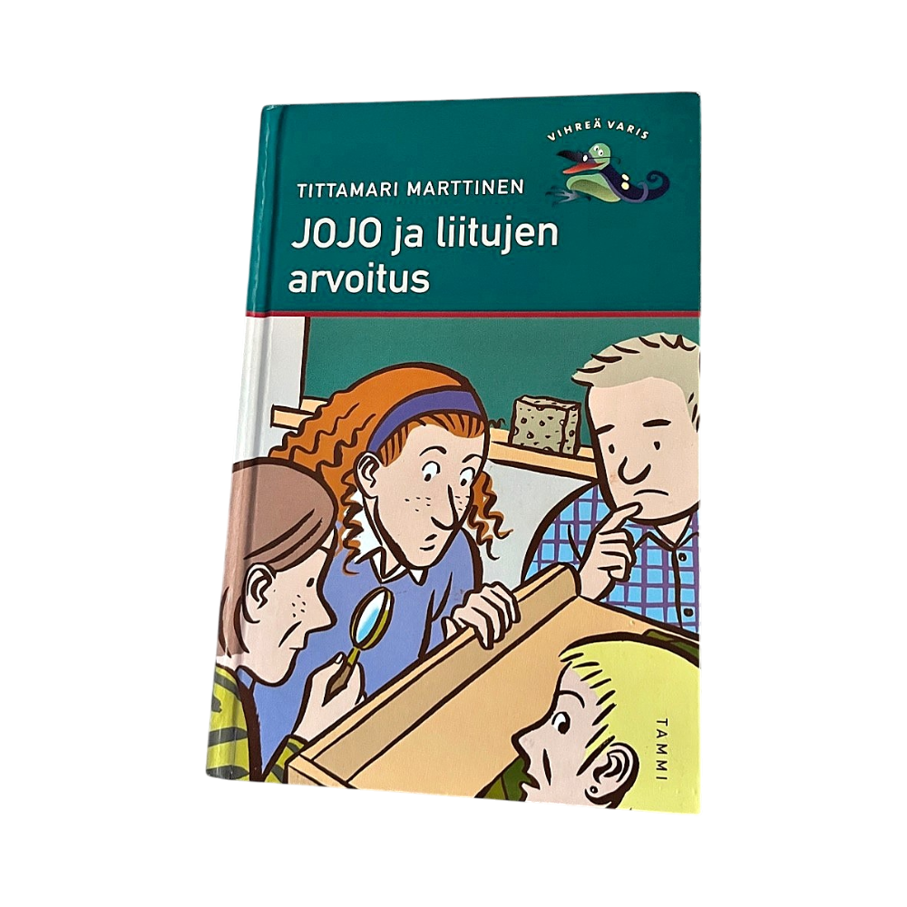 JOJO ja liitujen arvoitus -romaani, helppolukuinen nuorten kirja. Kannessa pari vekkiä.