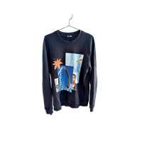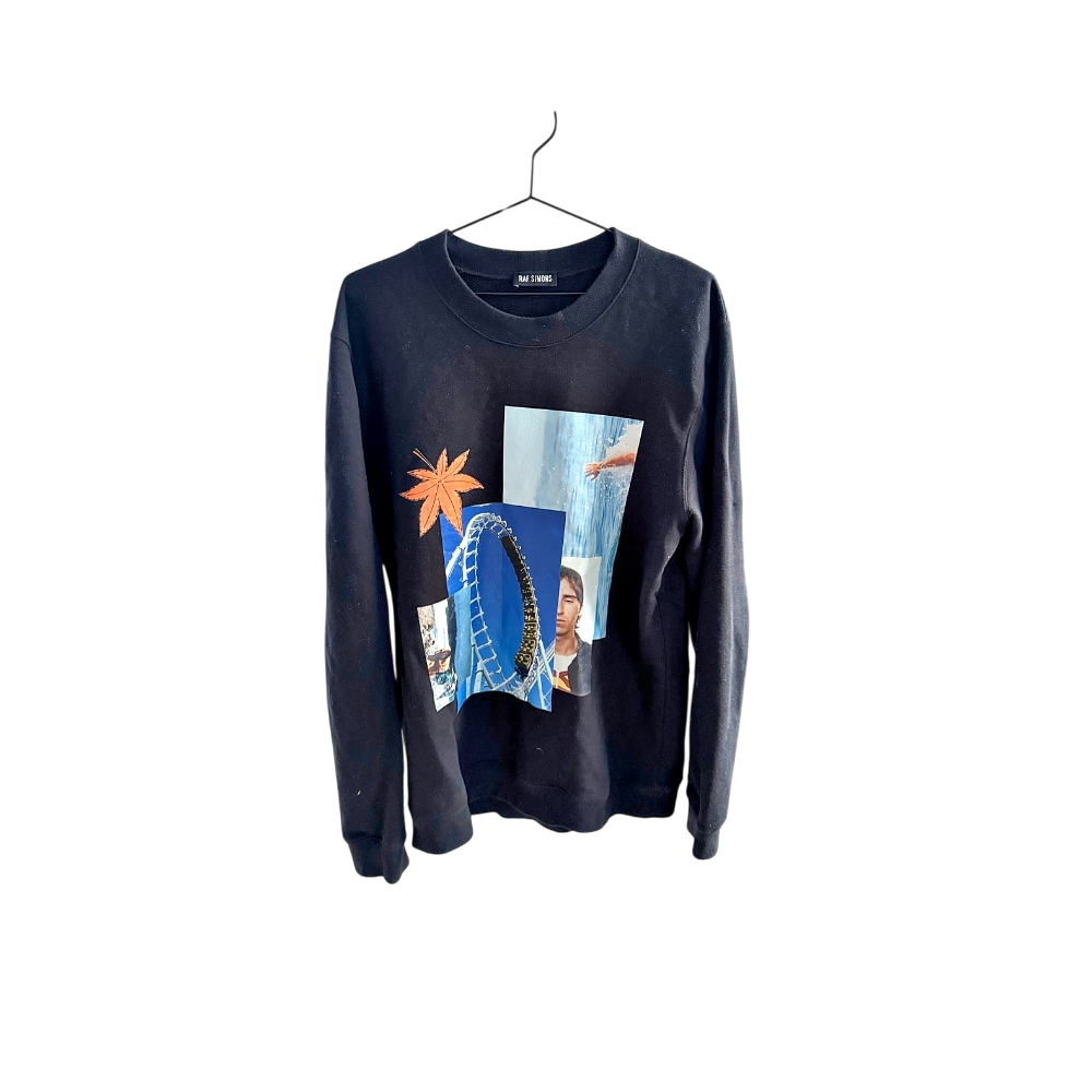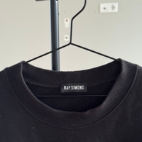 Musta Raf Simons college-paita printillä. Printissä pientä käytönjälkeä, kun katsoo tarkasti, mutta ei suurta kulumaa, crackeja jne. Paidan yleisilme siisti, kunto 8/10. Koko L.