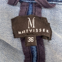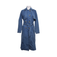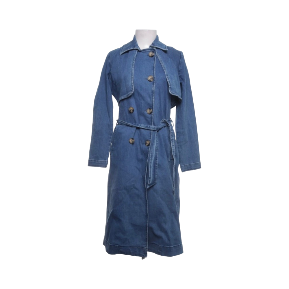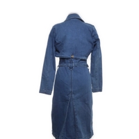 Sininen pitkä farkkutrenssi vyöllä, kaksirivinen napitus.