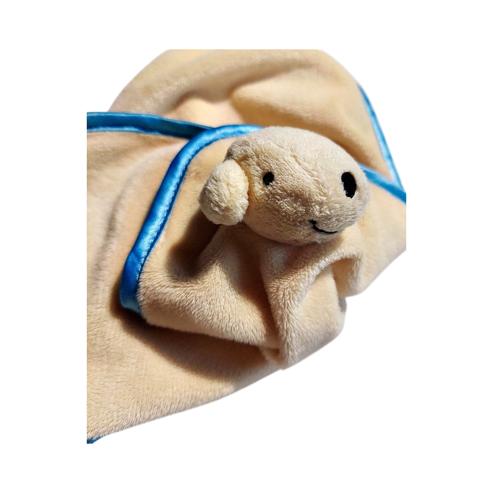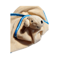 Pehmeä vauvan Puppe pehmoleluliina sinisellä reunuksella.
