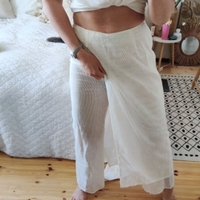 Upeat avangardistiset Marimekko Jukka Rintala housut. Läpikuultava kangas, mut 2 kertainen ylhäältä edestä ja takaa joten ei suoraan näy läpi. Koko 38, jota vastaa.