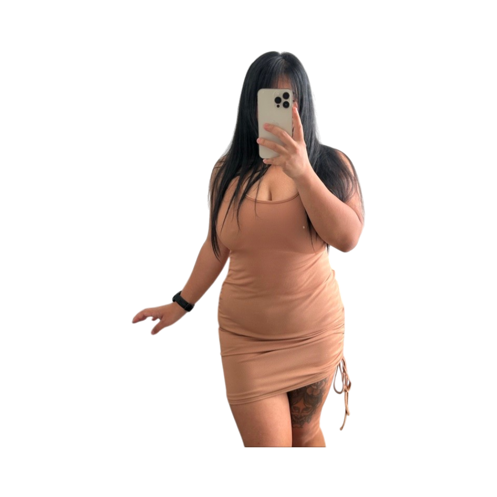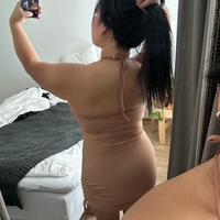 Ribattu, vartaloa myötäilevä mini-mekko, nyörityksellä sivussa.