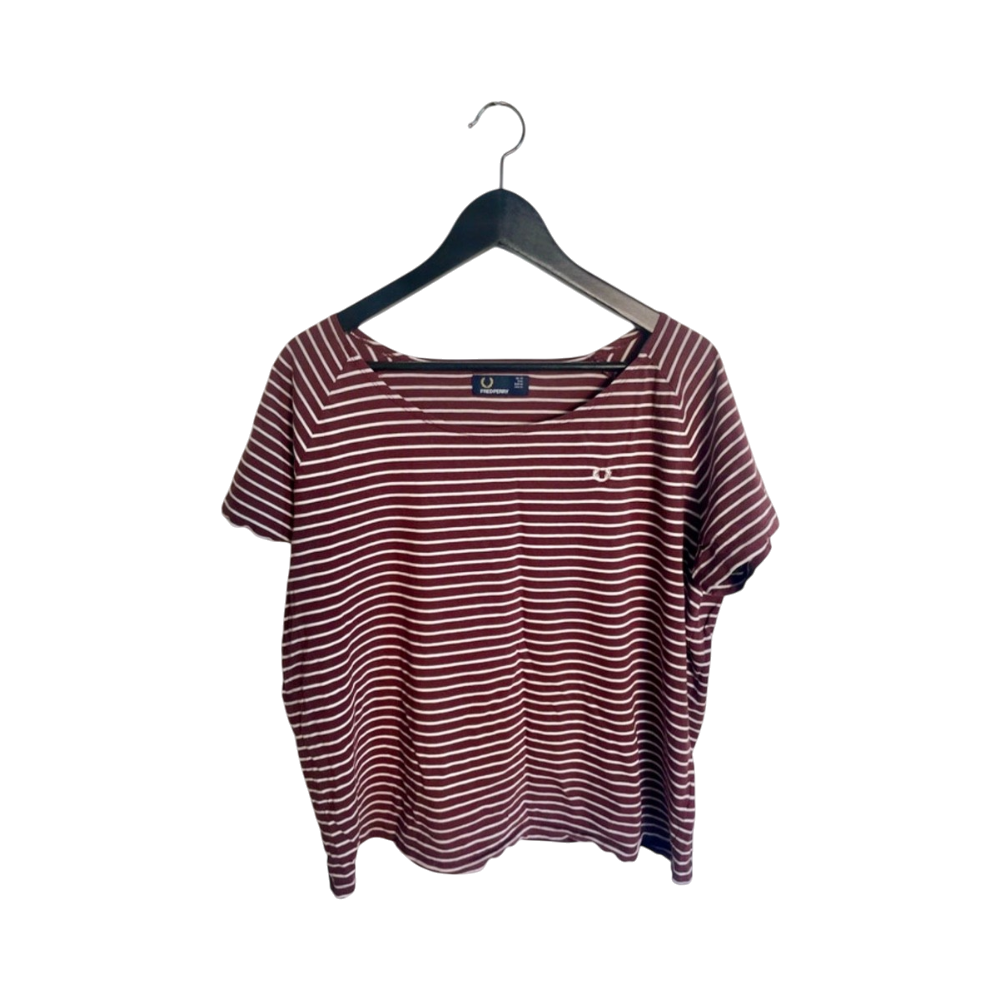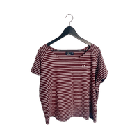 Viininpunainen ja valkoisen raidallinen t-paita. Hyvässä kunnossa, hieman pesunukkaa.