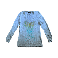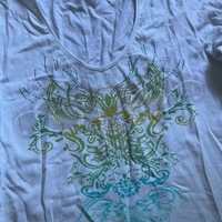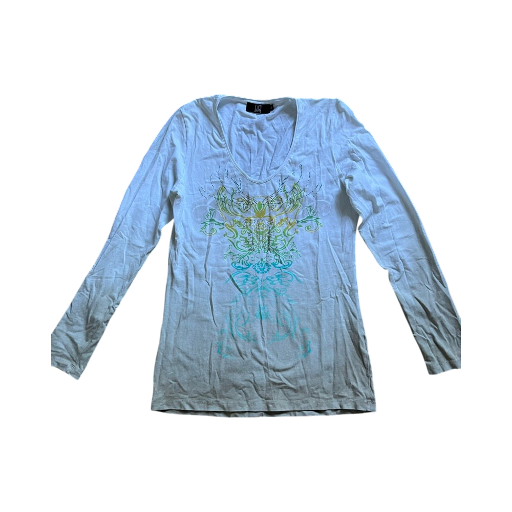 Valkoinen longsleeve liukuvärjäyksellä ja strasseilla. Kokolapussa 36, mutta vastaa enemmän 38.