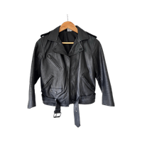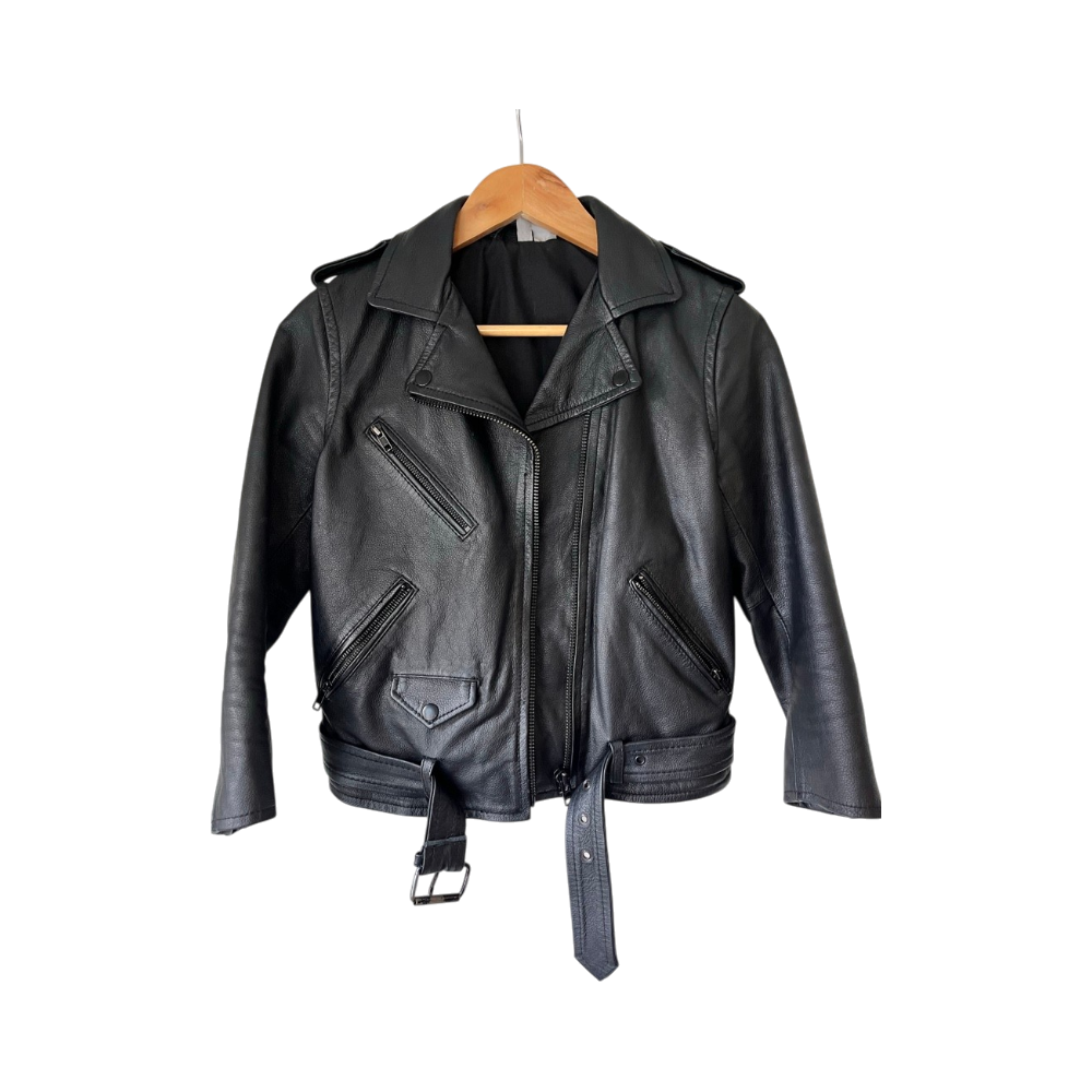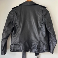 Musta bikernahkatakki aidosta nahasta. Vajaamittaiset (3/4) hihat. Kokomerkintä 38, mutta vastaa 36 kokoa.