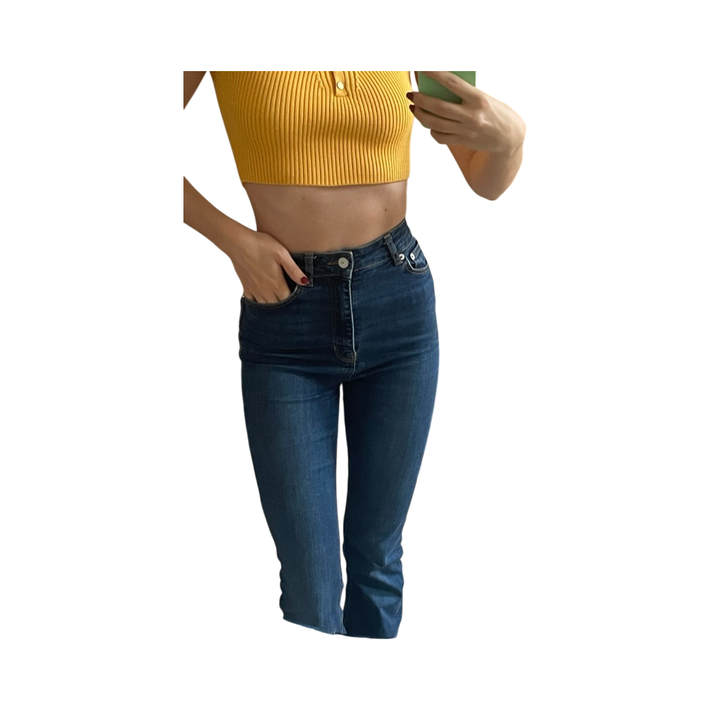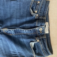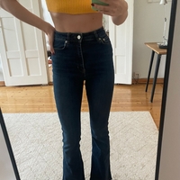 Myydään tummansiniset flared farkut. Farkuissa kulumaa (katso viimeinen kuva), mutta kuluma ei näy, kun farkut on päällä. Farkut on alunperin lyhennetty 165cm pituiselle, jonka takia ovat minulle liian lyhyet (169cm).