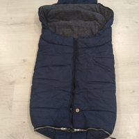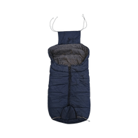 Quilted stroller footmuff with harness slots, navy and grey.