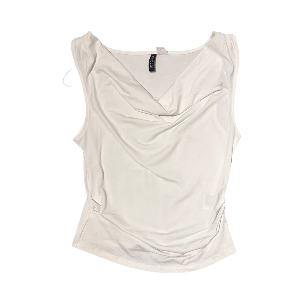 White sleeveless draped-neck top, lightweight and flattering fit.